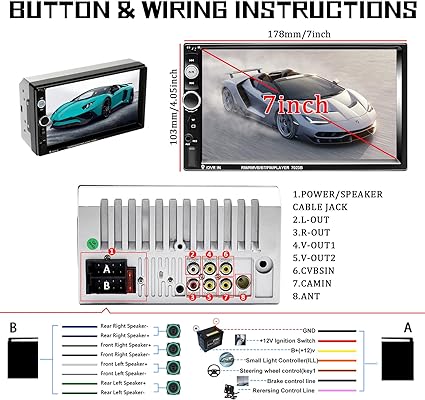 • ✽【Multifunction 】Camecho 7 inch 2 din HD 1080P car radio MP5 player Supports BT and hands-free calling, FM Radio, USB, TF Card (up to 32 GB), AUX IN, music player, video player, steering wheel control and back-up camera